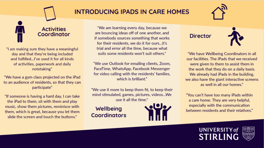 Deanfield Care Home Activities Coordinator, Nicole Winterbottom, integrates digital dimensions into daily residents’ activities using tablet technology supplied via public sector funding channels, including the TEC Connecting Scotland’s Care Homes initiative, part of the Scottish Government’s 2020 Covid-19 pandemic response.